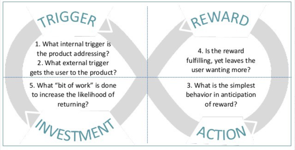 One day during lunch with colleagues I learned about the famous hook model. This model emphasized the importance of key principles that every good mobile product needs: Trigger, Action, Variable Reward, Investment